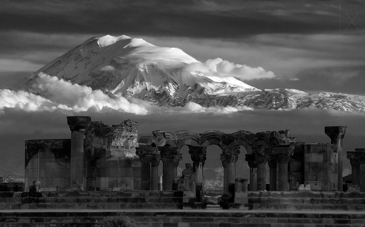 The photo with view of Ararat was taken from Armenian Zvartnots Cathedral 'celestial angels cathedral' built in 643-652.